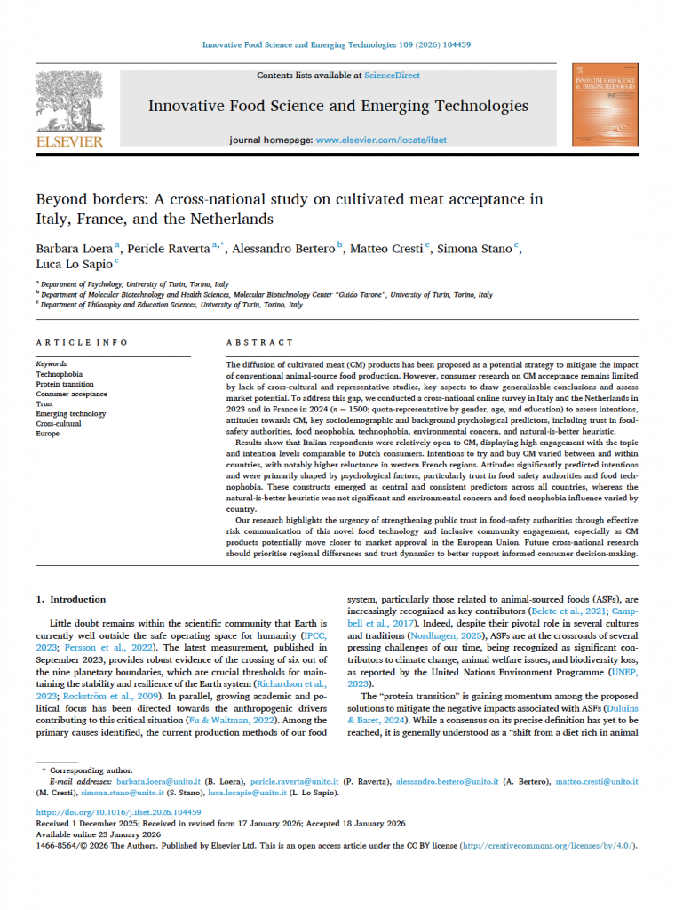 FINO, M.A., ANZÀ, B., BAIRATI, L., BERTINI, I., BIOLATTI, B., BIRESSI, S., CANNIZZO, F.T., CAVALLARIN, L., CONTI, L., DERIU, M., GARGIOLI, C., LOERA, B.L., LO SAPIO, L., MARCHISIO, D., PALLANTE, L., STANO, S., TORRI, L., BERTERO, A. e MASSAI, D. (2024) “Cultivated meat beyond bans: Ten remarks from the Italian case toward a reasoned decision-making process”, One Earth, 7(12): 2108-2111. ISSN: 2590-3322 (online); 2590-3330 (print) [EN].