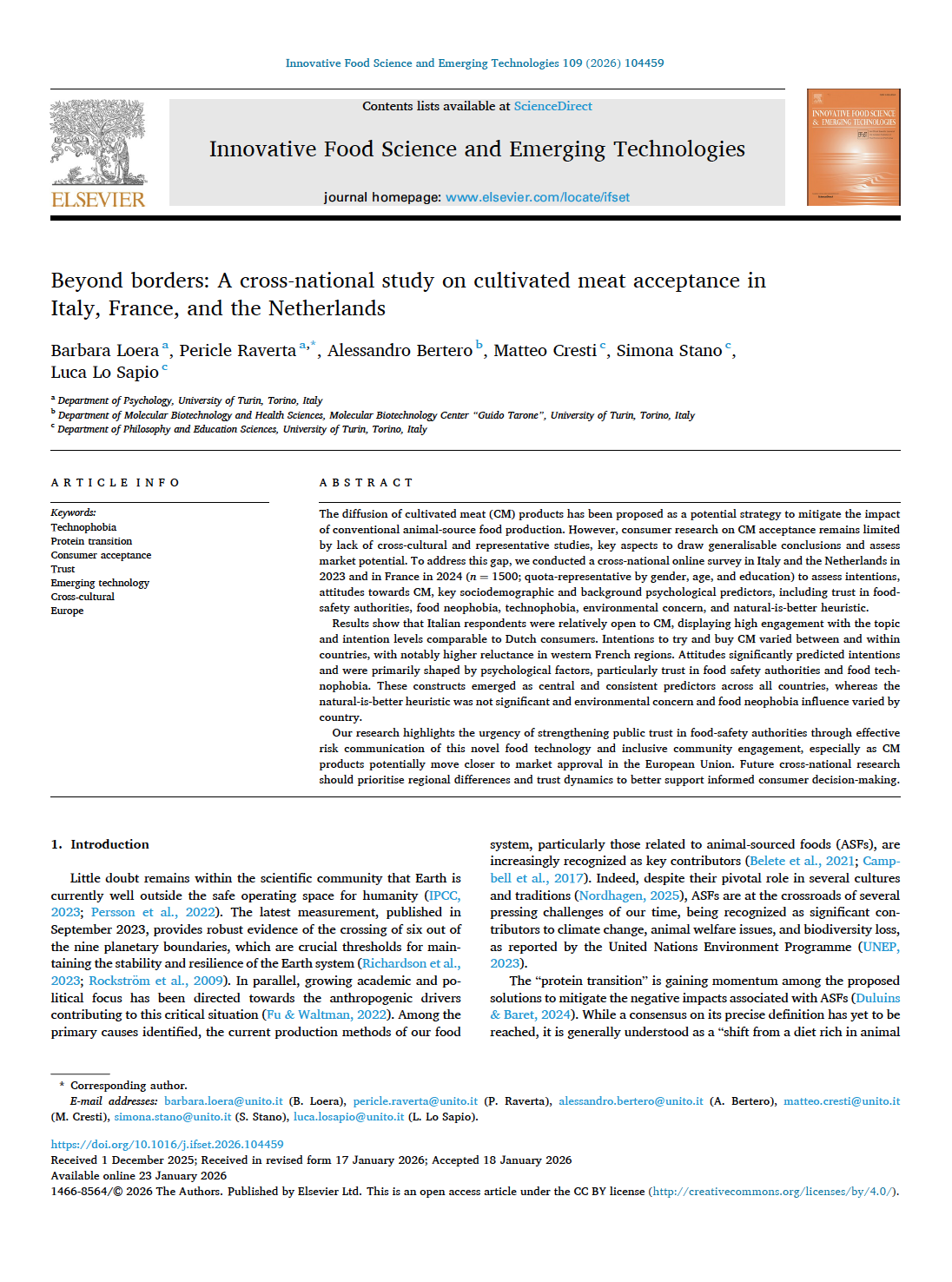 BERTERO, A., BIRESSI, S., BUSCEMI, F., CONTI, L., CRESTI, M., GARGIOLI, C., LO SAPIO, L. LOERA, B.L., PONCIBÒ, C. e STANO, S. (2023) “Serve un dibattito informato sulla carne coltivata Esperti in campo tecnico, sociale e umanistico invitano a una discussione razionale sul futuro del cibo”. Nature Italy, https://www.nature.com/articles/d43978-023-00057-0. ISSN: 2730-7999 [IT].