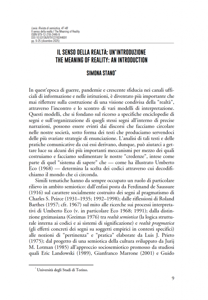 SANTANGELO A. e STANO, S. (a cura di) (2025, in preparazione) The Meaning of Reality / Il senso della realtà. Lexia 47-48. Roma: Aracne. ISSN: 1720-5298 [EN, IT, FR, ES].